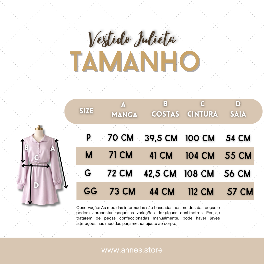 Romântico e elegante, o vestido Julieta é uma peça delicada que une sofisticação e feminilidade. Seu design apresenta modelagem confortável, com caimento leve e fluido que valoriza a silhueta.